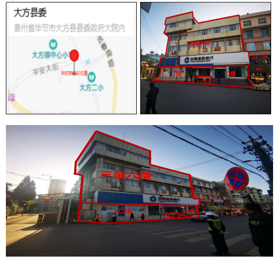 標(biāo)的物位于畢節(jié)市大方縣大方鎮(zhèn)南街1層至6層,總建筑面積:1479.43㎡,其中:1層建筑面積為222.97㎡,2層建筑面積為284.43㎡,3至6層建筑面積為972.03㎡,房屋所有權(quán)證號(hào):方房權(quán)證2005字第370609722號(hào);