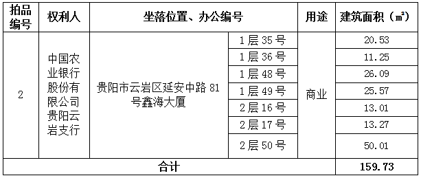 2、貴陽市云巖區(qū)延安中路81號鑫海大廈1層35、36、48、49號及2層16、17、50號商業(yè)房地產(chǎn)(總建筑面積:159.73㎡);