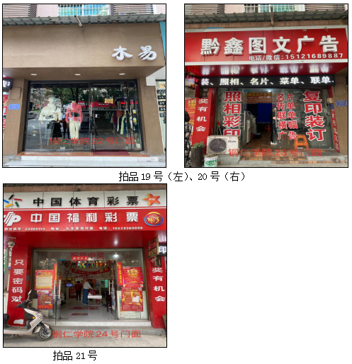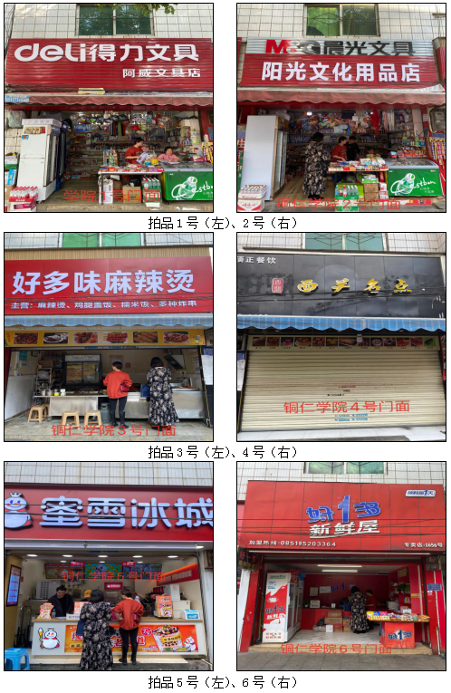 1.拍品1至21號標的位于銅仁市清水大道銅仁學(xué)院附中旁,面積7——28㎡,租賃期3年(2021.05.01至2024.04.30止),交通便利,人流量大。