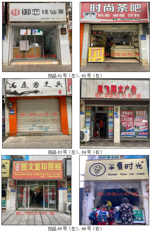 1.拍品49至66號標的位于銅仁市清水大道銅仁學(xué)院附中旁,面積15——44.4㎡,租賃期3年(2021.05.01至2024.04.30止),交通便利,人流量大。