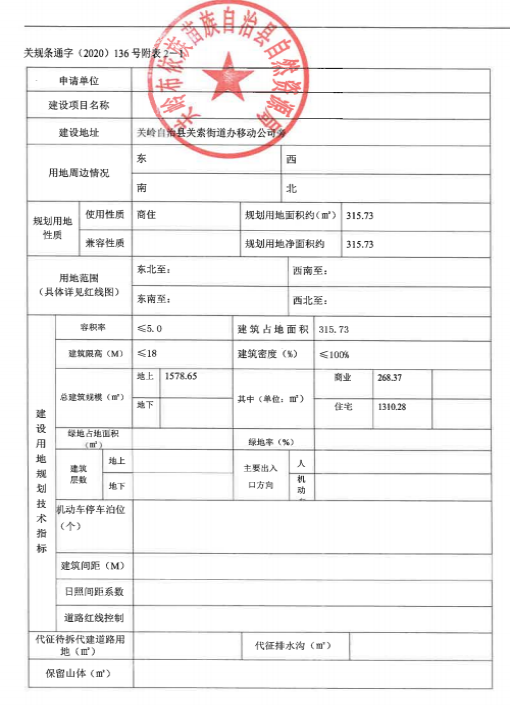 3、買受人須在簽訂出讓合同后,承諾一年內(nèi)開(kāi)工建設(shè),三年內(nèi)必須竣工驗(yàn)收。如不能按期開(kāi)工、竣工,自違約之日起,每日須支付土地出讓價(jià)款的0.55‰的違約金。建設(shè)嚴(yán)格按照自然資源局出具的關(guān)規(guī)條通字(2020)136號(hào)《規(guī)劃設(shè)計(jì)條件通知書》中的規(guī)定和要求進(jìn)行建設(shè):容積率≤5.0,建筑密度≤100%;地上總建筑面積:1578.65㎡,其中商業(yè)建筑面積:268.37㎡,住宅建筑面積:1310.28㎡;建筑限高≤18米。(詳見(jiàn)附件1)