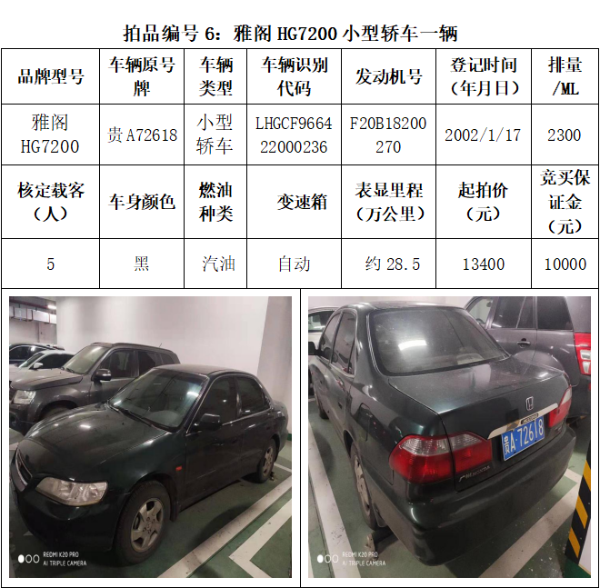 受委托,本公司定于2021年3月26日(星期五)下午14:30時(shí),在貴陽(yáng)市中華南路20號(hào)新大陸數(shù)碼廣場(chǎng)10樓D座拍賣(mài)廳公開(kāi)拍賣(mài)以下車輛:普拉多越野車1輛、超級(jí)維特拉越野車1輛、別克商務(wù)旅行車1輛、輝騰轎車1輛、途勝越野車1輛、雅閣轎車2輛、奧迪轎車1輛,長(zhǎng)城牌小型越野客車1輛,共計(jì)9輛車。