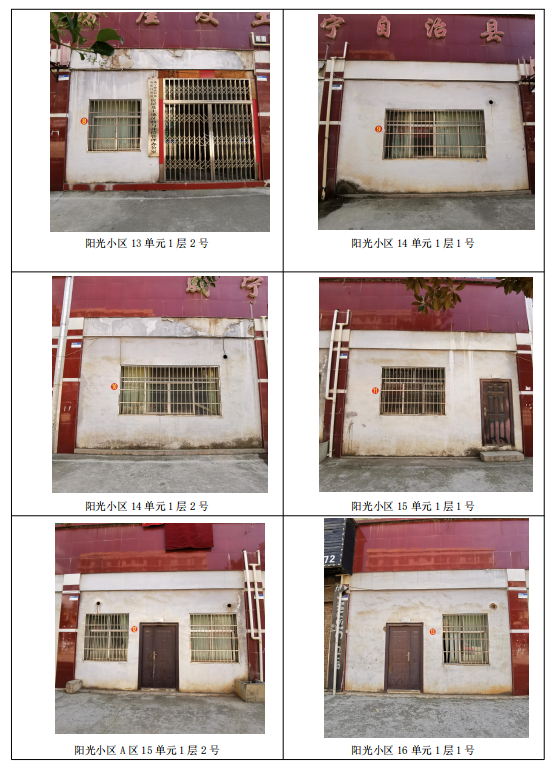 拍品編號16-21號標(biāo)的位于威寧縣海邊街道廣園路陽光小區(qū),房屋結(jié)構(gòu)均為:混合結(jié)構(gòu),權(quán)利性質(zhì):國有土地/出讓/其他,用途:商服用地/商業(yè)服務(wù),使用期限:2012年12月20號至2052年12月19日。