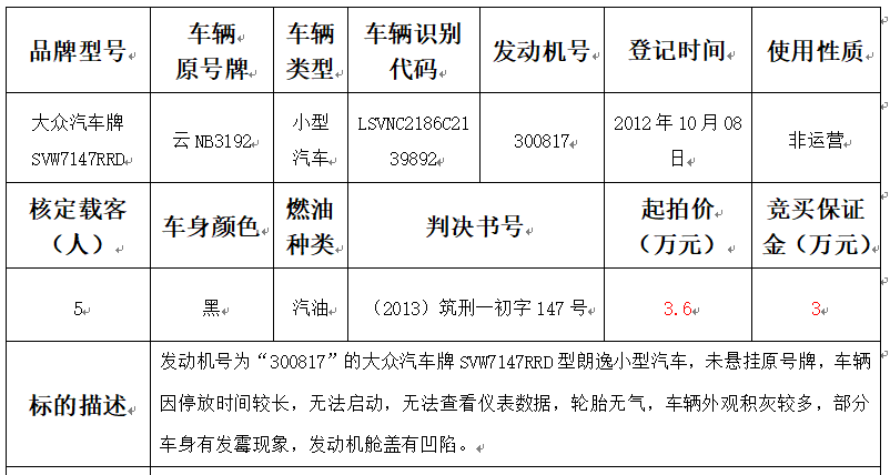 拍品編號(hào)2:大眾汽車牌SVW71410BL型帕薩特小型汽車一輛