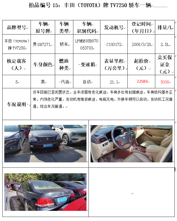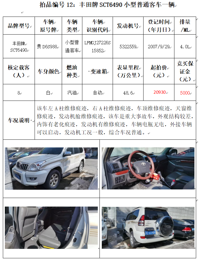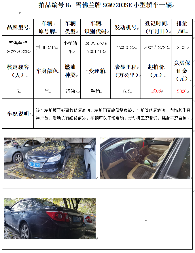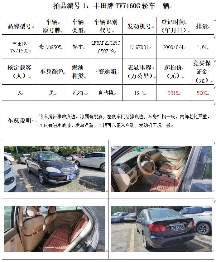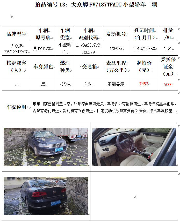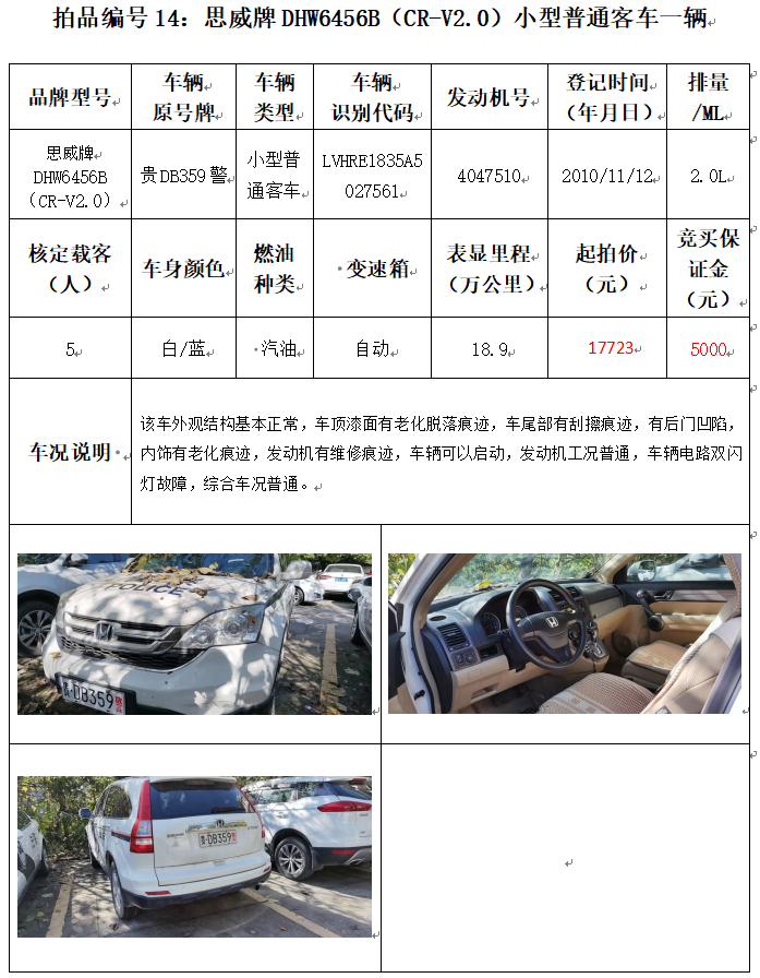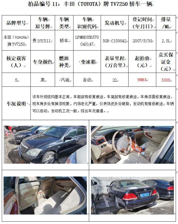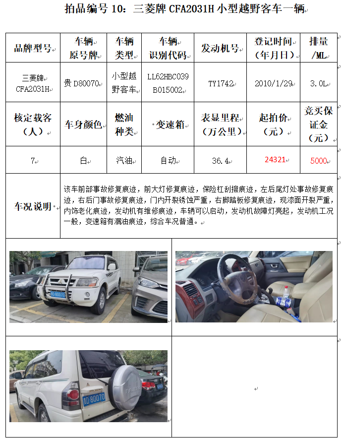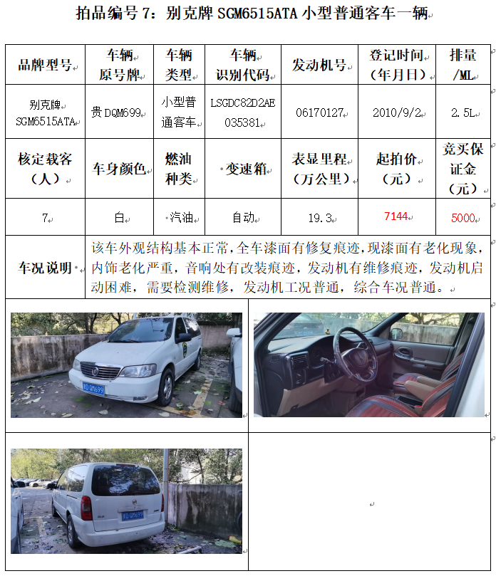 受委托,本公司定于2021年12月10日(星期五)下午14:00時(shí),在銅仁市碧江區(qū)川硐教育園區(qū)誠(chéng)信路銅仁市公共資源交易中心開標(biāo)六室(拍賣大廳)公開拍賣以下車輛: