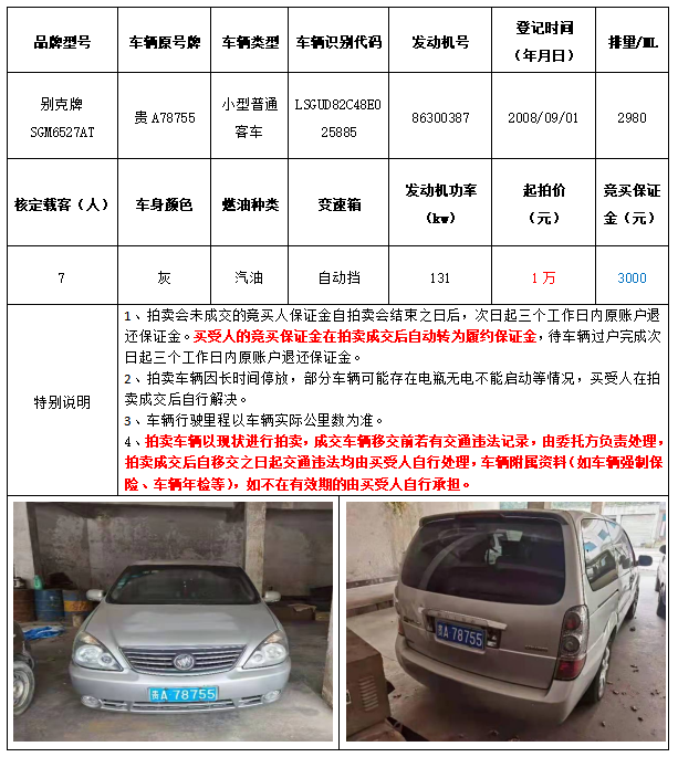 別克牌SGM6527AT小型普通客車1輛,起拍價(jià)1萬(wàn)元。