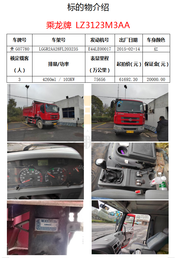 乘龍牌 LZ3123M3AA 貨車 1 輛,車牌號(hào)為貴 G07780 起拍價(jià): ¥ 61692.30 元 保證金:2 萬(wàn)元