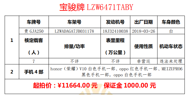 標(biāo)的一:貴GJA250寶駿牌730小型汽車一輛、honor(榮耀)V10白色手機一部、oppo紅色手機一部、MEIZUPRO6黑色手機一部,oppo白色手機一部。起拍價:11664.00元,保證金:1000.00元。