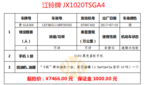 標(biāo)的二:貴GLK368 江鈴牌輕型貨車一輛、“卡蟻”牌加油機一臺、廢舊油罐(3.8m×2m×2m容積10噸)一個,VIVO黑色直板手機一部。起拍價:7466.00元,保證金:1000.00元。