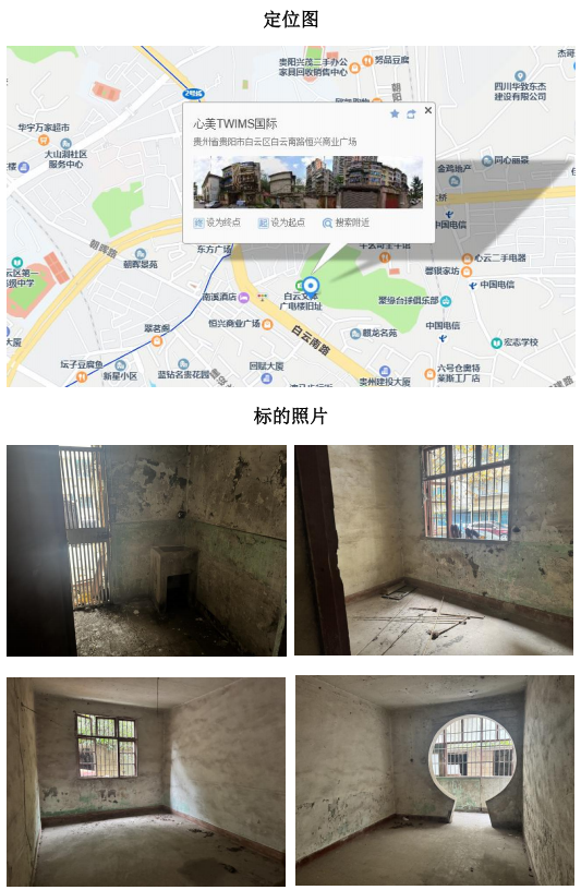 標的坐落于白云區(qū)白云南路50號1單元1層2號,房屋總層數(shù)為4層,拍賣標的所在層數(shù)為1層,產(chǎn)權證編號:黔(2025)白云區(qū)不動產(chǎn)權第0005922號,權利類型:國有建設用地使用權/房屋所有權,權利性質(zhì):劃撥/自建房,用途:城鎮(zhèn)住宅用地/成套住宅,建筑面積:54.5㎡,房屋結(jié)構(gòu):混合結(jié)構(gòu)。